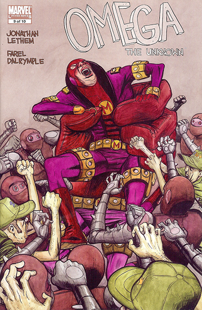 | Omega: The Unknown No. 9 - August, 2008. Published monthly by MARVEL PUBLISHING, INC. a subsidiary of MARVEL ENTERTAINMENT, INC. OFFICE OF PUBLICATION: 417 5th Avenue, New York, NY 10016. © 2008 Marvel Characters, Inc. All rights reserved. All characters featured in this issue and the distinctive names and likenesses therof, and all related indicia are trademarks of Marvel Characters, Inc. No similarity between any of the names, characters, persons, and/or institutions in this magazine with those of any living or dead persons or institutions is intended, and any such similarity which may exist is purely conicidental. |