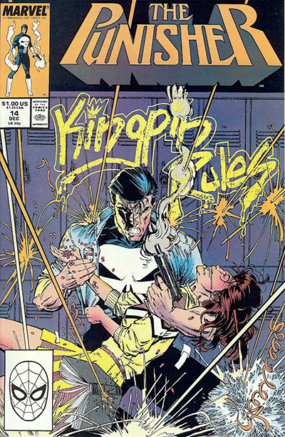 | The Punisher No. 14 - December, 1988. Published monthly by MARVEL PUBLISHING, INC. a subsidiary of MARVEL ENTERTAINMENT, INC. OFFICE OF PUBLICATION: 417 5th Avenue, New York, NY 10016. © 1988 Marvel Characters, Inc. All rights reserved. All characters featured in this issue and the distinctive names and likenesses therof, and all related indicia are trademarks of Marvel Characters, Inc. No similarity between any of the names, characters, persons, and/or institutions in this magazine with those of any living or dead persons or institutions is intended, and any such similarity which may exist is purely conicidental. |