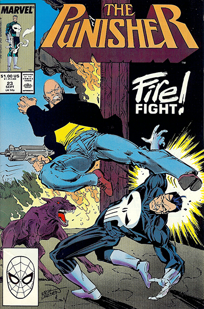 | The Punisher No. 23 - September, 1989. Published monthly by MARVEL PUBLISHING, INC. a subsidiary of MARVEL ENTERTAINMENT, INC. OFFICE OF PUBLICATION: 417 5th Avenue, New York, NY 10016. © 1989 Marvel Characters, Inc. All rights reserved. All characters featured in this issue and the distinctive names and likenesses therof, and all related indicia are trademarks of Marvel Characters, Inc. No similarity between any of the names, characters, persons, and/or institutions in this magazine with those of any living or dead persons or institutions is intended, and any such similarity which may exist is purely conicidental. |
