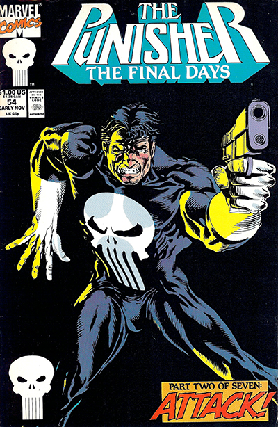 | The Punisher No. 54 - November, 1991. Published monthly by MARVEL PUBLISHING, INC. a subsidiary of MARVEL ENTERTAINMENT, INC. OFFICE OF PUBLICATION: 417 5th Avenue, New York, NY 10016. © 1991 Marvel Characters, Inc. All rights reserved. All characters featured in this issue and the distinctive names and likenesses therof, and all related indicia are trademarks of Marvel Characters, Inc. No similarity between any of the names, characters, persons, and/or institutions in this magazine with those of any living or dead persons or institutions is intended, and any such similarity which may exist is purely conicidental. |