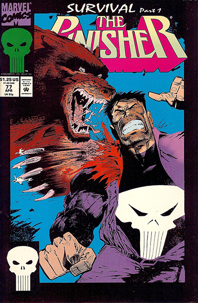 | The Punisher No. 77 - April, 1993. Published monthly by MARVEL PUBLISHING, INC. a subsidiary of MARVEL ENTERTAINMENT, INC. OFFICE OF PUBLICATION: 417 5th Avenue, New York, NY 10016. © 1993 Marvel Characters, Inc. All rights reserved. All characters featured in this issue and the distinctive names and likenesses therof, and all related indicia are trademarks of Marvel Characters, Inc. No similarity between any of the names, characters, persons, and/or institutions in this magazine with those of any living or dead persons or institutions is intended, and any such similarity which may exist is purely conicidental. |