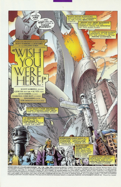 | Adventures Of Cyclops And Phoenix No. 1 - May, 1994. Published monthly by MARVEL PUBLISHING, INC. a subsidiary of MARVEL ENTERTAINMENT, INC. OFFICE OF PUBLICATION: 417 5th Avenue, New York, NY 10016. © 1994 Marvel Characters, Inc. All rights reserved. All characters featured in this issue and the distinctive names and likenesses therof, and all related indicia are trademarks of Marvel Characters, Inc. No similarity between any of the names, characters, persons, and/or institutions in this magazine with those of any living or dead persons or institutions is intended, and any such similarity which may exist is purely conicidental. |