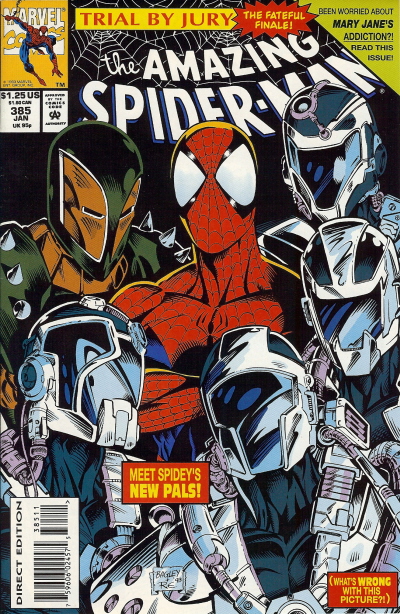 | Amazing Spider-Man No. 385 - January, 1994. Published monthly by MARVEL PUBLISHING, INC. a subsidiary of MARVEL ENTERTAINMENT, INC. OFFICE OF PUBLICATION: 417 5th Avenue, New York, NY 10016. © 1994 Marvel Characters, Inc. All rights reserved. All characters featured in this issue and the distinctive names and likenesses therof, and all related indicia are trademarks of Marvel Characters, Inc. No similarity between any of the names, characters, persons, and/or institutions in this magazine with those of any living or dead persons or institutions is intended, and any such similarity which may exist is purely conicidental. |