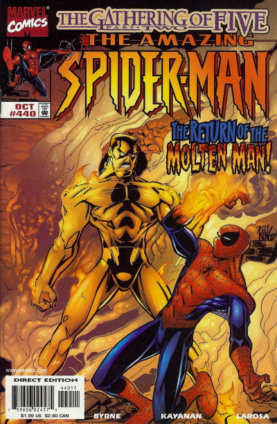 | Amazing Spider-Man No. 440 - October, 1998. Published monthly by MARVEL PUBLISHING, INC. a subsidiary of MARVEL ENTERTAINMENT, INC. OFFICE OF PUBLICATION: 417 5th Avenue, New York, NY 10016. © 1998 Marvel Characters, Inc. All rights reserved. All characters featured in this issue and the distinctive names and likenesses therof, and all related indicia are trademarks of Marvel Characters, Inc. No similarity between any of the names, characters, persons, and/or institutions in this magazine with those of any living or dead persons or institutions is intended, and any such similarity which may exist is purely conicidental. |