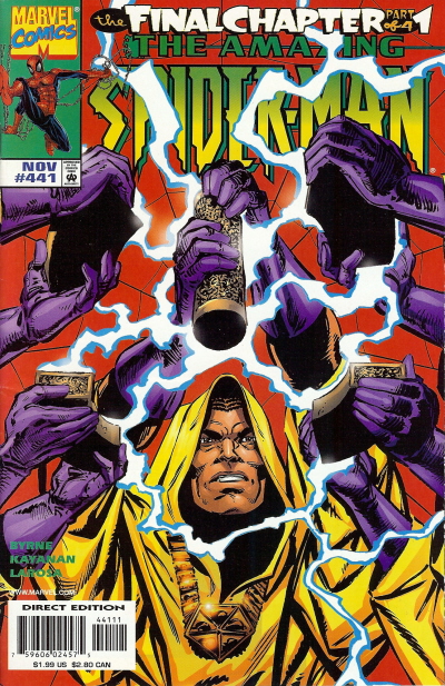 | Amazing Spider-Man No. 441 - November, 1998. Published monthly by MARVEL PUBLISHING, INC. a subsidiary of MARVEL ENTERTAINMENT, INC. OFFICE OF PUBLICATION: 417 5th Avenue, New York, NY 10016. © 1998 Marvel Characters, Inc. All rights reserved. All characters featured in this issue and the distinctive names and likenesses therof, and all related indicia are trademarks of Marvel Characters, Inc. No similarity between any of the names, characters, persons, and/or institutions in this magazine with those of any living or dead persons or institutions is intended, and any such similarity which may exist is purely conicidental. |