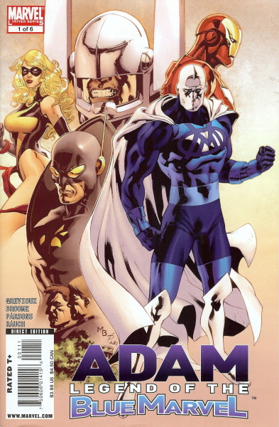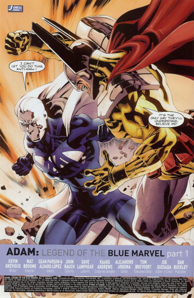 | Adam: Legend Of The Blue Marvel No. 1 - January, 2009. Published monthly by MARVEL PUBLISHING, INC. a subsidiary of MARVEL ENTERTAINMENT, INC. OFFICE OF PUBLICATION: 417 5th Avenue, New York, NY 10016. © 2009 Marvel Characters, Inc. All rights reserved. All characters featured in this issue and the distinctive names and likenesses therof, and all related indicia are trademarks of Marvel Characters, Inc. No similarity between any of the names, characters, persons, and/or institutions in this magazine with those of any living or dead persons or institutions is intended, and any such similarity which may exist is purely conicidental. |