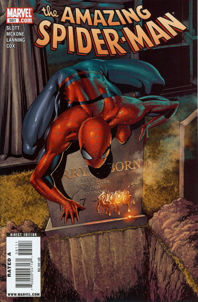 | Amazing Spider-Man No. 581 - February, 2009. Published monthly by MARVEL PUBLISHING, INC. a subsidiary of MARVEL ENTERTAINMENT, INC. OFFICE OF PUBLICATION: 417 5th Avenue, New York, NY 10016. © 2009 Marvel Characters, Inc. All rights reserved. All characters featured in this issue and the distinctive names and likenesses therof, and all related indicia are trademarks of Marvel Characters, Inc. No similarity between any of the names, characters, persons, and/or institutions in this magazine with those of any living or dead persons or institutions is intended, and any such similarity which may exist is purely conicidental. |