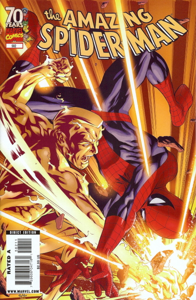 | Amazing Spider-Man No. 582 - March, 2009. Published monthly by MARVEL PUBLISHING, INC. a subsidiary of MARVEL ENTERTAINMENT, INC. OFFICE OF PUBLICATION: 417 5th Avenue, New York, NY 10016. © 2009 Marvel Characters, Inc. All rights reserved. All characters featured in this issue and the distinctive names and likenesses therof, and all related indicia are trademarks of Marvel Characters, Inc. No similarity between any of the names, characters, persons, and/or institutions in this magazine with those of any living or dead persons or institutions is intended, and any such similarity which may exist is purely conicidental. |
