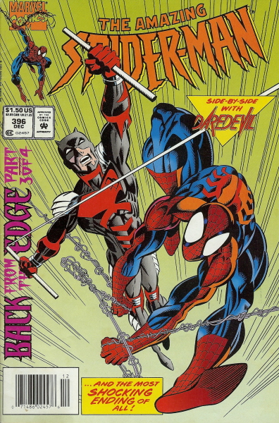 | Amazing Spider-Man No. 396 - December, 1994. Published monthly by MARVEL PUBLISHING, INC. a subsidiary of MARVEL ENTERTAINMENT, INC. OFFICE OF PUBLICATION: 417 5th Avenue, New York, NY 10016. © 1994 Marvel Characters, Inc. All rights reserved. All characters featured in this issue and the distinctive names and likenesses therof, and all related indicia are trademarks of Marvel Characters, Inc. No similarity between any of the names, characters, persons, and/or institutions in this magazine with those of any living or dead persons or institutions is intended, and any such similarity which may exist is purely conicidental. |