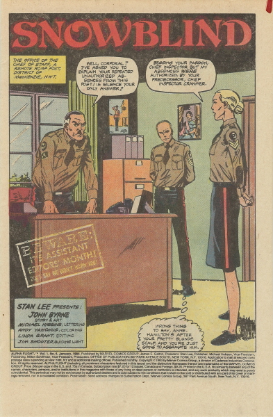 Alpha Flight No. 6 - January, 1984. Published monthly by MARVEL PUBLISHING, INC. a subsidiary of MARVEL ENTERTAINMENT, INC. OFFICE OF PUBLICATION: 417 5th Avenue, New York, NY 10016. © 1984 Marvel Characters, Inc. All rights reserved. All characters featured in this issue and the distinctive names and likenesses therof, and all related indicia are trademarks of Marvel Characters, Inc. No similarity between any of the names, characters, persons, and/or institutions in this magazine with those of any living or dead persons or institutions is intended, and any such similarity which may exist is purely conicidental. |