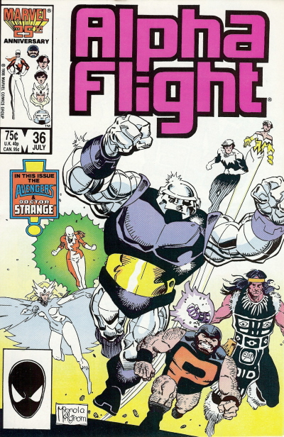 Alpha Flight No. 36 - July, 1986. Published monthly by MARVEL PUBLISHING, INC. a subsidiary of MARVEL ENTERTAINMENT, INC. OFFICE OF PUBLICATION: 417 5th Avenue, New York, NY 10016. © 1986 Marvel Characters, Inc. All rights reserved. All characters featured in this issue and the distinctive names and likenesses therof, and all related indicia are trademarks of Marvel Characters, Inc. No similarity between any of the names, characters, persons, and/or institutions in this magazine with those of any living or dead persons or institutions is intended, and any such similarity which may exist is purely conicidental. |
