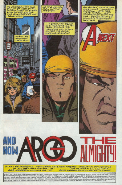 | A-Next No. 6 - March, 1999. Published monthly by MARVEL PUBLISHING, INC. a subsidiary of MARVEL ENTERTAINMENT, INC. OFFICE OF PUBLICATION: 417 5th Avenue, New York, NY 10016. © 1999 Marvel Characters, Inc. All rights reserved. All characters featured in this issue and the distinctive names and likenesses therof, and all related indicia are trademarks of Marvel Characters, Inc. No similarity between any of the names, characters, persons, and/or institutions in this magazine with those of any living or dead persons or institutions is intended, and any such similarity which may exist is purely conicidental. |