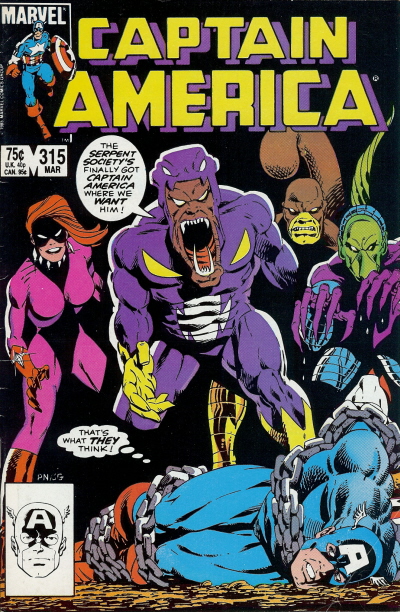 | Captain America No. 315 - March, 1986. Published monthly by MARVEL PUBLISHING, INC. a subsidiary of MARVEL ENTERTAINMENT, INC. OFFICE OF PUBLICATION: 417 5th Avenue, New York, NY 10016. © 1986 Marvel Characters, Inc. All rights reserved. All characters featured in this issue and the distinctive names and likenesses therof, and all related indicia are trademarks of Marvel Characters, Inc. No similarity between any of the names, characters, persons, and/or institutions in this magazine with those of any living or dead persons or institutions is intended, and any such similarity which may exist is purely conicidental. |